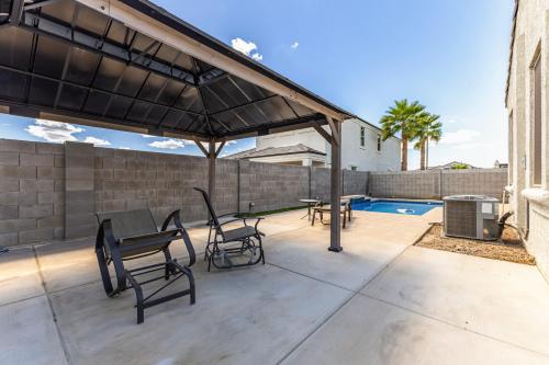 Welcome to this beautifully maintained 5-year-old home in Tartesso, offering 4 spacious bedrooms plus a versatile office/den that can easily be converted into a 5th bedroom. Thoughtfully designed with a highly desirable floorplan, this home provides both comfort and privacy for everyday living. At the front of the home, you'll find a private bedroom and full bath -- ideal for guests or multigenerational living. Two additional bedrooms are situated mid-home and share a full bathroom, while the primary suite is tucked away at the back for added privacy and relaxation. All bedrooms feature plush carpeting, while the main living areas showcase beautiful, neutral-toned tile that complements any décor style. The open-concept kitchen flows seamlessly into a spacious great room, highlighted by abundant windows that fill the space with natural light. The kitchen is appointed with modern granite countertops, a striking black backsplash, and ample space for gathering and entertaining. The laundry room is generously sized and includes the washer and dryer -- making move-in a breeze. Blinds are installed throughout the home for added convenience and comfort. Step outside to your own backyard retreat. The seller has thoughtfully enhanced the outdoor space with added concrete and pavers, a charming gazebo for shaded relaxation, artificial turf along one side of the home, and a sparkling pool complete with a soothing waterfall feature -- creating the perfect setting for entertaining or unwinding. A rare find, this is currently the only 4-bedroom home in Tartesso on the market with a pool. Additional highlights include a 3-car garage with epoxy-coated flooring and beautiful stone detailing along the exterior trim, adding to the home's curb appeal. This home truly offers the ideal combination of layout, upgrades, and lifestyle.