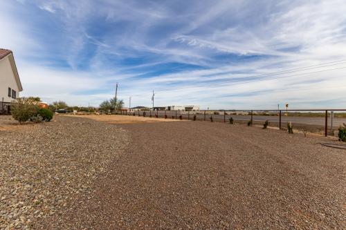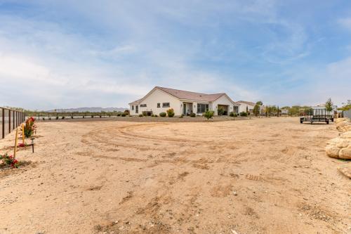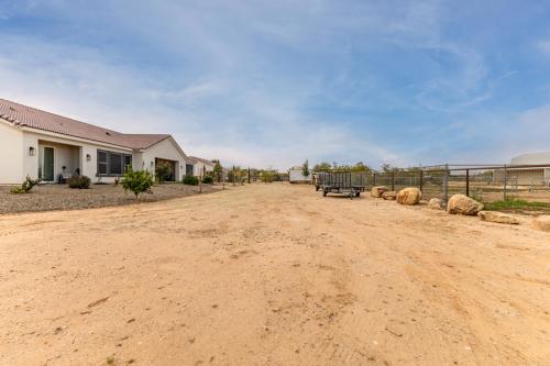 Luxurious Modern Custom Estate on Over ¾ Acre! Experience refined desert living in this impeccably designed modern custom home, perfectly situated on over three-quarters of an acre with unobstructed, serene desert and mountain vistas. Every detail has been thoughtfully curated, from soaring 10-12' ceilings and solid 8' doors to upgraded luxury vinyl plank and designer tile flooring throughout. The expansive open-concept Kitchen and Great Room create an ideal space for both everyday living and grand entertaining. The gourmet kitchen is a showpiece, featuring abundant cabinetry, granite countertops, tile backsplash, top-tier light fixtures, and a massive walk-in pantry. Enjoy both formal and casual dining areas, while dramatic 4-panel sliding doors seamlessly blend indoor and outdoor living. A beautifully tiled fireplace anchors the main living space with warmth and sophistication. The primary suite is a private retreat, offering a spa-inspired bath with a resort-style walk-in shower, separate soaking tub, and a dual-entry walk-in closet that conveniently connects to the oversized laundry room. Two additional en-suite bedrooms each feature walk-in showers, providing comfort and privacy for guests or family. A spacious den with its own courtyard exit offers versatility as a home office, lounge, or optional fourth bedroom. Thoughtful touches continue throughout with refined hall cabinetry, premium finishes, and exceptional craftsmanship. Car enthusiasts and hobbyists will appreciate the extensive parking and flexible garage options, including a long paver driveway, side RV gate, extended-length 2-car garage, and a separate third-car garage with sliding door courtyard access - ideal for a workshop, fitness studio, or car. The fully fenced yard is designed for easy maintenance and maximum enjoyment, featuring desert landscaping, artificial turf, a travertine patio, and elegant paver steps. With ample room to add a pool, RV parking, horse facilities, or create your own custom outdoor oasis, the possibilities are endless. This extraordinary property offers luxury and panoramic natural beauty - an absolute must-see. Furnishings available on a separate bill of sale.
