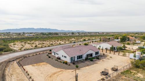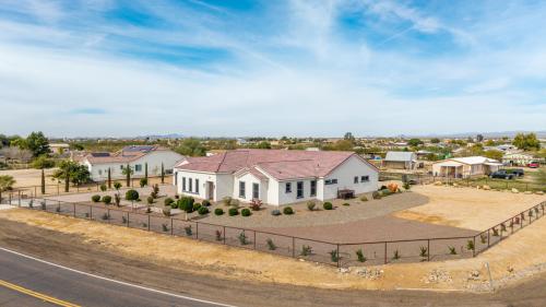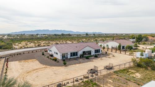 Luxurious Modern Custom Estate on Over ¾ Acre! Experience refined desert living in this impeccably designed modern custom home, perfectly situated on over three-quarters of an acre with unobstructed, serene desert and mountain vistas. Every detail has been thoughtfully curated, from soaring 10-12' ceilings and solid 8' doors to upgraded luxury vinyl plank and designer tile flooring throughout. The expansive open-concept Kitchen and Great Room create an ideal space for both everyday living and grand entertaining. The gourmet kitchen is a showpiece, featuring abundant cabinetry, granite countertops, tile backsplash, top-tier light fixtures, and a massive walk-in pantry. Enjoy both formal and casual dining areas, while dramatic 4-panel sliding doors seamlessly blend indoor and outdoor living. A beautifully tiled fireplace anchors the main living space with warmth and sophistication. The primary suite is a private retreat, offering a spa-inspired bath with a resort-style walk-in shower, separate soaking tub, and a dual-entry walk-in closet that conveniently connects to the oversized laundry room. Two additional en-suite bedrooms each feature walk-in showers, providing comfort and privacy for guests or family. A spacious den with its own courtyard exit offers versatility as a home office, lounge, or optional fourth bedroom. Thoughtful touches continue throughout with refined hall cabinetry, premium finishes, and exceptional craftsmanship. Car enthusiasts and hobbyists will appreciate the extensive parking and flexible garage options, including a long paver driveway, side RV gate, extended-length 2-car garage, and a separate third-car garage with sliding door courtyard access - ideal for a workshop, fitness studio, or car. The fully fenced yard is designed for easy maintenance and maximum enjoyment, featuring desert landscaping, artificial turf, a travertine patio, and elegant paver steps. With ample room to add a pool, RV parking, horse facilities, or create your own custom outdoor oasis, the possibilities are endless. This extraordinary property offers luxury and panoramic natural beauty - an absolute must-see. Furnishings available on a separate bill of sale.