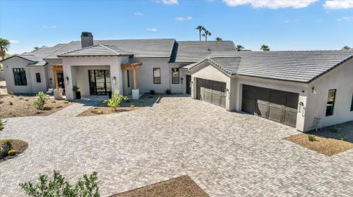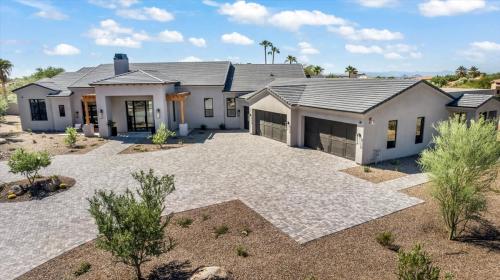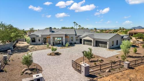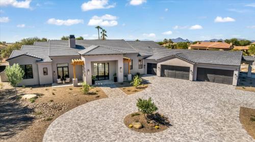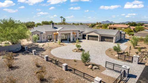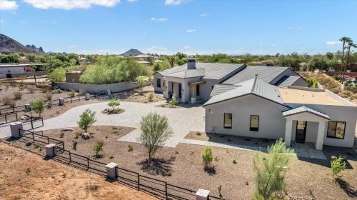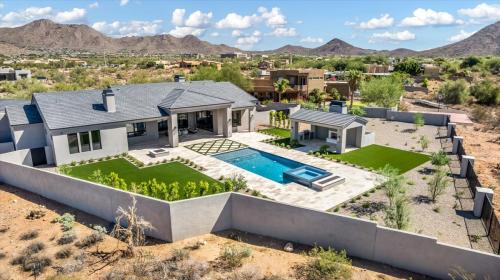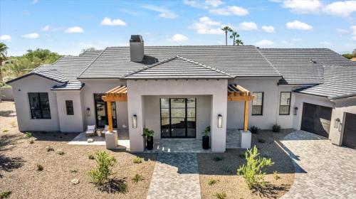 Privately gated and brand-new, this Modern Mediterranean estate is a true Scottsdale compound, offering room to breathe on a 1.158-acre cul-de-sac lot in the coveted Shea Corridor. A custom 10-foot iron door opens to a 15-foot grand foyer crowned by a 48-inch chandelier, setting the stage for refined living. Walls of 18-foot stacking glass in both the formal great room and the expansive playroom/game room blur the line between indoors and out, revealing more than 1,700 square feet of covered patios and dramatic mountain views. Designed for seamless entertaining, the chef's kitchen showcases Sub-Zero and Wolf appliances, a massive island, and a butler's bar, while European oak floors and Isokern fireplaces with limestone surrounds create timeless elegance. The primary suite is a private retreat with dual showers, soaking tub, and limestone fireplace. A 964-sq-ft attached casita with full kitchen and private entrance is ideal for guests or multi-generational living. Outdoors, enjoy a heated 38-foot pool with Baja shelf, Champagne-edge spa, two fire-pits, a 15×25 ramada with open-flame fireplace, and a full outdoor kitchenall with ample space to add a pickleball or sport court if you desire. This home is moments from top schools, world-class golf, fine dining, and upscale shopping. Everything you could ask for in this spectacular Scottsdale home.