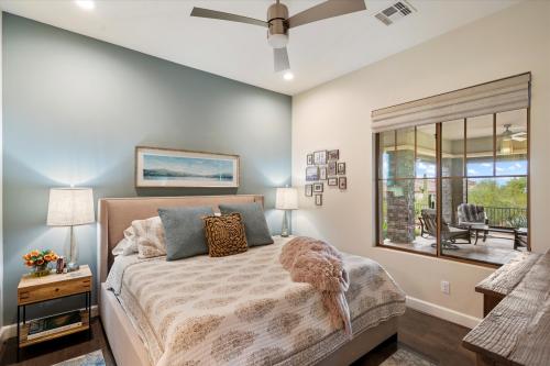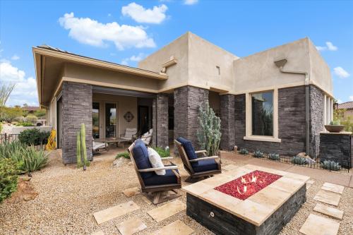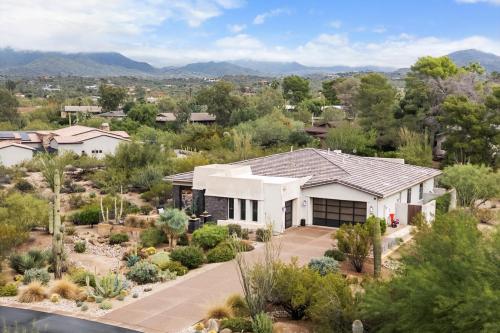 Discover Move-In-Ready Luxury in Carefree, AZ This stunning entertainer's dream, located in the gated Reserve at Tranquil Trail, offers panoramic mountain views and epitomizes modern luxury blended with desert resort-style living. This custom-built residence, completed in 2015, is perfect for buyers seeking a refined and sophisticated lifestyle. Step inside to find a gourmet kitchen equipped with high-end appliances, custom cabinetry, and an impressive waterfall island. The open-concept great room showcases elegant wood beams, a stacked-stone entertainment wall, and a remarkable 14-foot folding glass door that seamlessly connects indoor and outdoor living spaces. The primary suite features dual walk-in closets and is thoughtfully separated from the two guest rooms for privacy.