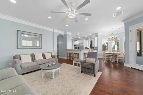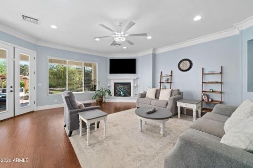 Rare opportunity to own a private gated acreage estate on a desirable County Island setting just minutes from Downtown Gilbert. Set on almost 2 irrigated acres, this single-level residence offers over 4,100 square feet with five bedrooms, a dedicated office, and six bathrooms. The grounds are a defining feature, showcasing gardens, raised beds, and a plentiful variety of mature fruit trees including citrus, fig, pear, plum, and stone fruit. Outdoor living centers around a resort-style pool with swim-up bar, shaded gazebos, and a convenient exterior-access pool bath. Additional highlights include canal and trail access, observation deck views, four-car garage, and generous parking areas. The property offers exceptional privacy, space, and the freedom that comes with a County Island Estate Overview: Rare opportunity to own a private gated estate on nearly two irrigated acres in a highly desirable County Island setting just minutes from the energy, dining, and entertainment of Downtown Gilbert. Properties offering this combination of irrigated land, privacy, mature orchards, and convenient access to the town's vibrant amenities are increasingly difficult to find. The residence is thoughtfully positioned near the center of the parcel, allowing expansive grounds to unfold in every direction and creating the sense of a private estate compound surrounded by gardens, trees, and open land. Arrival & Grounds: Entry begins through a secure gated compound featuring three vehicle gates, including a primary automated entrance that opens to a sweeping circular driveway and expansive motor court designed for ease of access and impressive arrival. Mature landscaping and shade trees frame the approach while the surrounding acreage provides separation from neighboring properties. Private road access enhances privacy and convenience. A private gate leads directly to the adjacent canal and trail system, offering opportunities for walking, cycling, and outdoor recreation. An elevated observation deck provides views of the surrounding landscape and nearby regional park lake while capturing sunsets and community events in the distance. The expansive irrigated acreage offers exceptional flexibility for outdoor living and land use. Livestock and horses are permitted on the property, creating opportunities for equestrian use or hobby farming. The grounds provide ample space for horse stalls, barn structures, or animal enclosures, while still maintaining generous room for gardens, orchard areas, and outdoor entertaining spaces. Residence: The estate features a spacious single-level custom residence with over 4,100 square feet designed for comfortable living and entertaining. The floor plan includes five bedrooms plus a dedicated office with private exterior entrance, ideal for a home office, studio, or meeting space. The home offers six bathrooms, including a convenient exterior-access pool bath designed for guests enjoying the outdoor amenities. Architectural details throughout include three fireplaces, real wood flooring, crown molding, oversized baseboards, and extensive custom cabinetry and built-in storage. The split floor plan allows the primary suite to remain private while secondary bedrooms provide comfortable accommodations for family and guests. Primary Suite: The primary retreat offers generous space and a spa-inspired bathroom highlighted by an extraordinary walk-in shower and large Jacuzzi soaking tub, creating a relaxing environment designed for comfort and rejuvenation. Secondary Bedrooms: Each additional bedroom features its own private bathroom and walk-in closet, creating privacy and flexibility for family members, guests, or extended household living. Kitchen & Gathering Areas: The kitchen and gathering spaces are designed for connection and entertaining, featuring granite countertops, generous preparation areas, and open living spaces that flow naturally into the surrounding entertaining areas. Outdoor Living & Entertaining: Outdoor living is a defining feature of the property. The backyard centers around a resort-style pool with water features and a swim-up bar with integrated seating, creating an environment designed for relaxation and entertaining. The pool area, with two expansive gazebos provide shaded gathering spaces for outdoor dining, entertaining, and lounging. Covered patio areas extend the living space outdoors, and the exterior-access pool bath allows guests to use restroom facilities without entering the home. Orchard, Gardens & Irrigation: One of the most unique aspects of the property is the productive orchard and garden environment supported by a flood irrigation system that sustains the nearly two-acre landscape. Raised garden beds with automated irrigation allow for cultivation of vegetables, herbs, and ornamental plantings. Mature grapevines contribute to the productive landscape and enhance the estate garden atmosphere. Exquisite Citrus Grove (approximately 20 mature trees): Key lime, Eureka lemon, navel orange, Ruby Red grapefruit, tangelo, blood orange, mandarin, white pomelo. Luscious Stone Fruit & Specialty Trees: Peach, apricot, fig, pear, plum, vineyard-quality grapevines. Ornamental Landscape Trees: Magnificent magnolia trees and mature ash shade trees provide canopy and shade throughout the grounds, contributing to the park-like environment and creating inviting outdoor spaces across the estate. Garage & Parking: The property includes an oversized four-car garage along with a large motor court and expansive driveway areas. These spaces allow parking capacity for approximately 50+ vehicles, making the estate ideal for gatherings, entertaining, events, or accommodating vehicle collections. Mechanical Systems & Infrastructure: The property benefits from a newly installed 2025 high-efficiency variable-speed inverter HVAC system designed for superior comfort and energy efficiency. Additional infrastructure features include dual washer and dryer hookups in the dedicated l