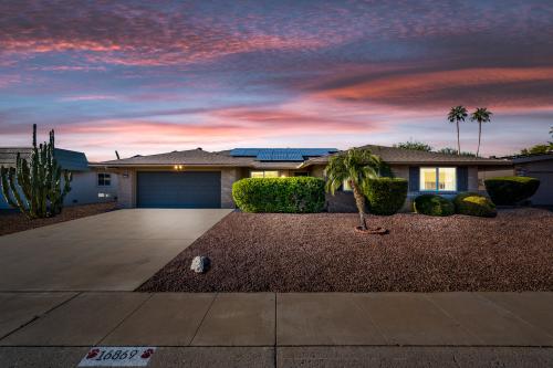 dining. Spacious primary bedroom with modern remodeled bathroom, xtra vanity area & walk-in closet. Guest Bedroom #2 has a wall of built-in closets & Bedroom #3 set-up as a dual office with custom built-ins. Ceiling fans throughout, recessed lighting, new garage door, 2 car garage w/extended space. 2025 remodeled kitchen, 2025 exterior painted. 2024 new HVAC. 2022 new roof. Solar panels provide reduced electric averaging $15-$28 per month. Ownership/Lease Monthly Assumption $165. Large Covered Patio overlooking the spacious low maintenance yard. The perfect patio to just relax and read a good book or entertain guests with plenty of room for everyone! Patio is enclosed by a low block fence and gated for added privacy. Vacation Everyday as an owner in Sun City! Drive your golf cart to the Bell Recreation Center or multiple recreation centers, activity clubs, swimming, pickleball, 8 golf courses, mini-golf, concerts, dancing and enjoy all of the fantastic benefits and amenities of Sun City ownership. You'll LOVE it here!